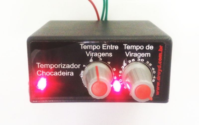 Controle de viragem dos ovos podendo regular o tempo entre viragens de 1 a 8 horas e permite ajuste do tempo de viragem de 1 a 55 segundos para desligar a viragem basta deixar o tempo entre viragens em OFF.